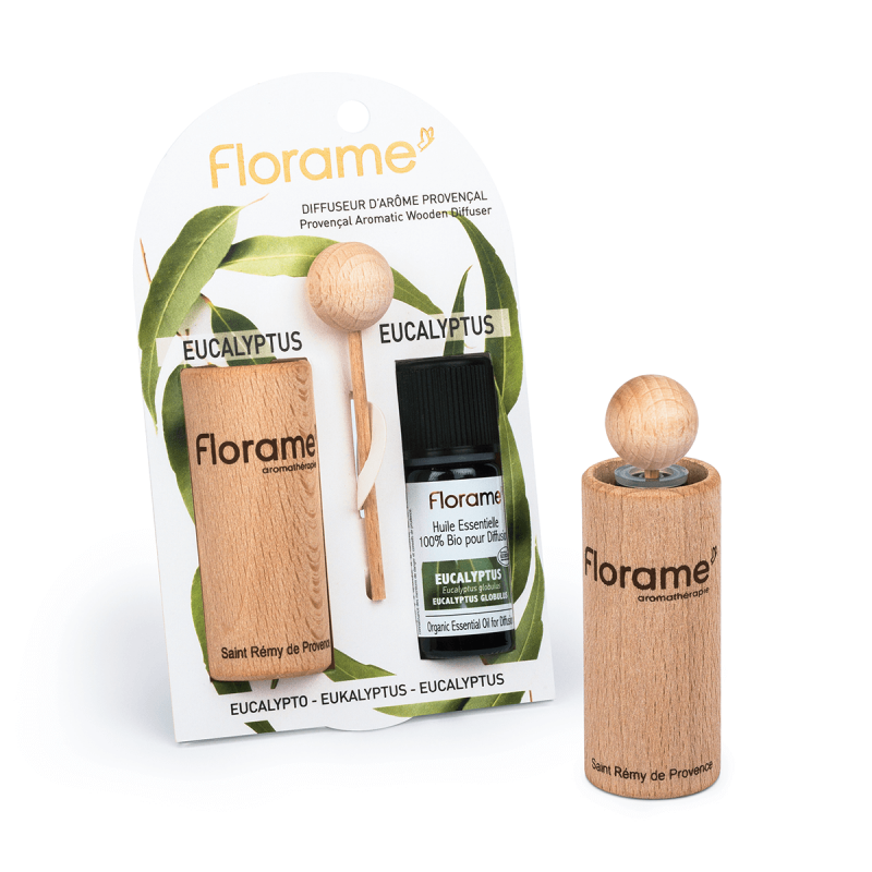 The florame laboratory proposes a range called PROVENCAL WOODEN DIFFUSERS, which diffuse essential oils by capillary action using a small wooden ball at the end of a stick.The wooden stick is inserted into the bottle up to the level of the essential oil. It can be pushed down as the oil is consumed.It comes with a wooden holder for the bottle of essential oil. This gives the product a discreet and elegant look.These diffusers are offewhite with a varied choice of essential oils. Any essential oil for diffusion can be used in this way in a confined space (car, office, cupboards, etc.). Description Invigorating for easy breathing and clearing your nose. Ideal for the car, bedside table, near your computer fan, etc.