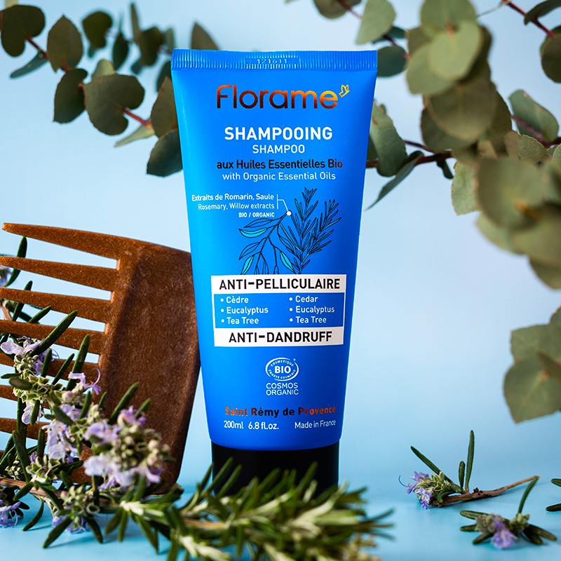 Le Shampooing Bio Antipelliculaire Florame, formulé sans sulfate1 est enrichi en huiles essentielles biologiques de Cèdre, Tea Tree et Eucalyptus, aux propriétés rééquilibrantes ainsi qu’en extraits végétaux biologiques de Romarin et Saule aux vertus purifiantes.